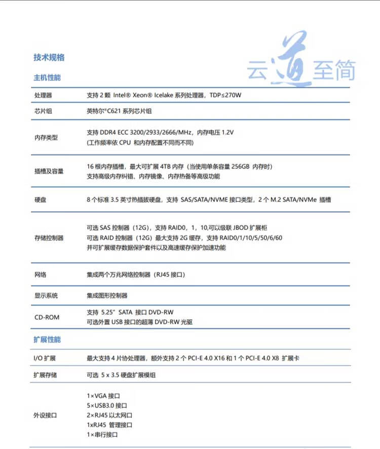 超云R8424 G12 2*津逮C6348 2*64GB 2*480G SATA 3.84T GEN3 M.2 1*RAID卡3108芯片 3年硬盘免回收服务