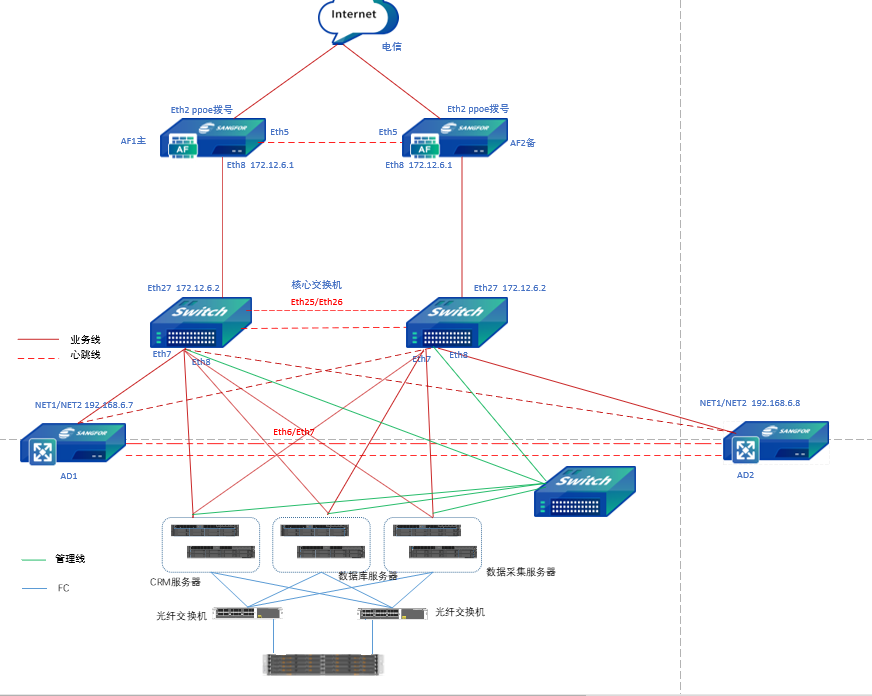 为了保证业务的可靠性,本次项目中的AF防火墙,AD负载均衡,交换机和服务器都配了两台,如业务系统出现故障,可随时接替业务系统的运行,以防止单机宕机导致业务中断而导致损失。