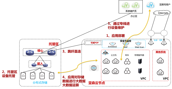 BENCOM的技术工程师通过在资源池托管区托管分布式存储设备、网络设备和安全设备,托管区通过裸纤直连核心交换机和云POP点,应用主机则可以通过对托管区的数据进行大数据运算生成分析结果。这样一来,云上的分析数据就可以在私有云端进行计算,分析结果则在公有云进行呈现。
